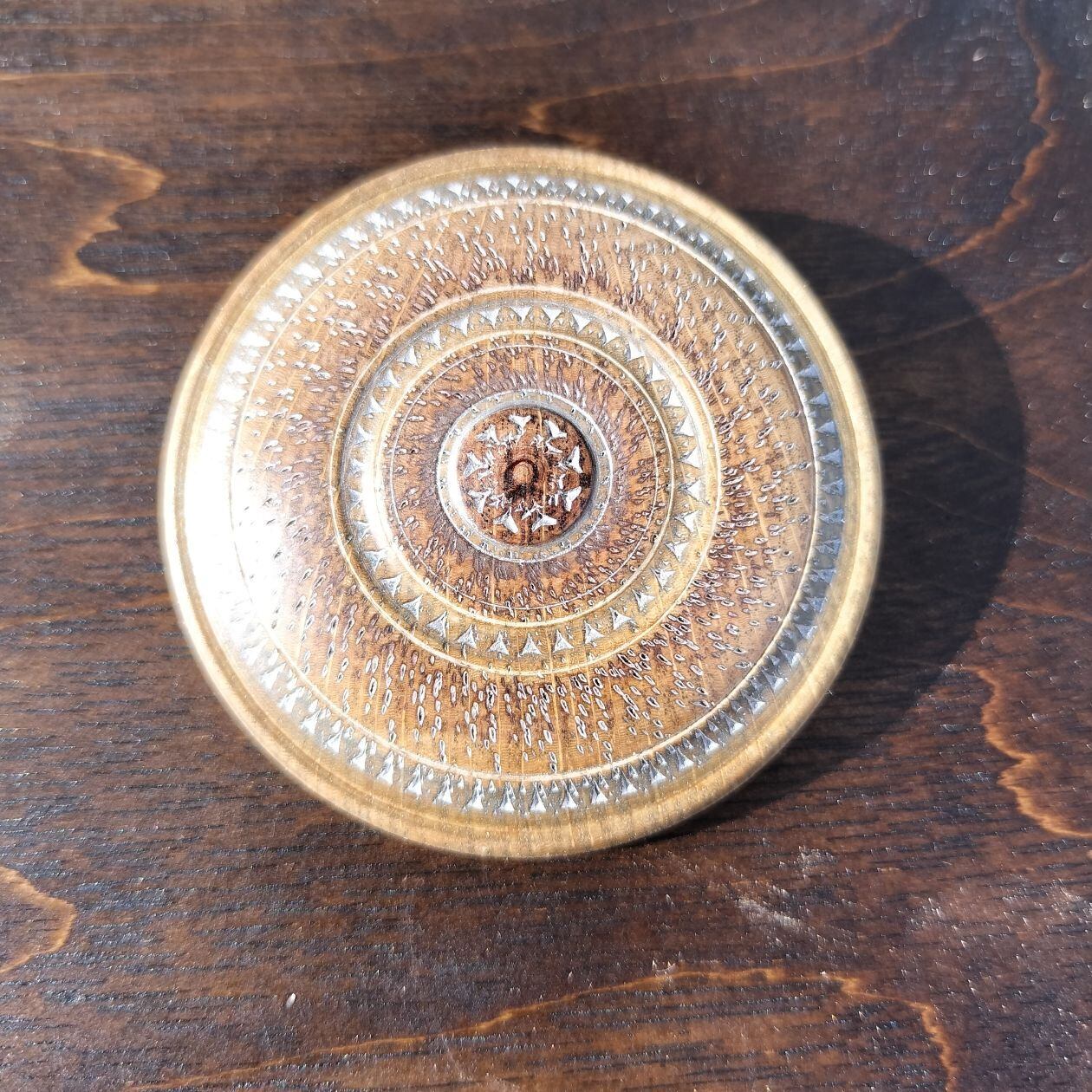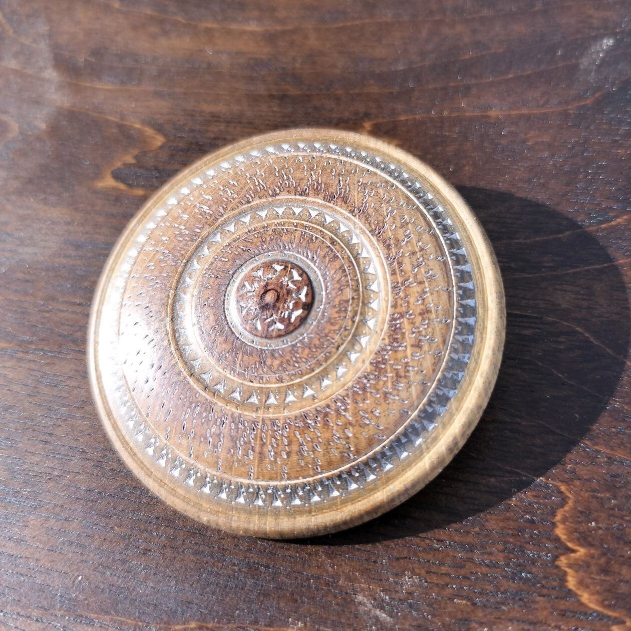 直径5cmの木の木口面に繊細な模様を刻み付けています。