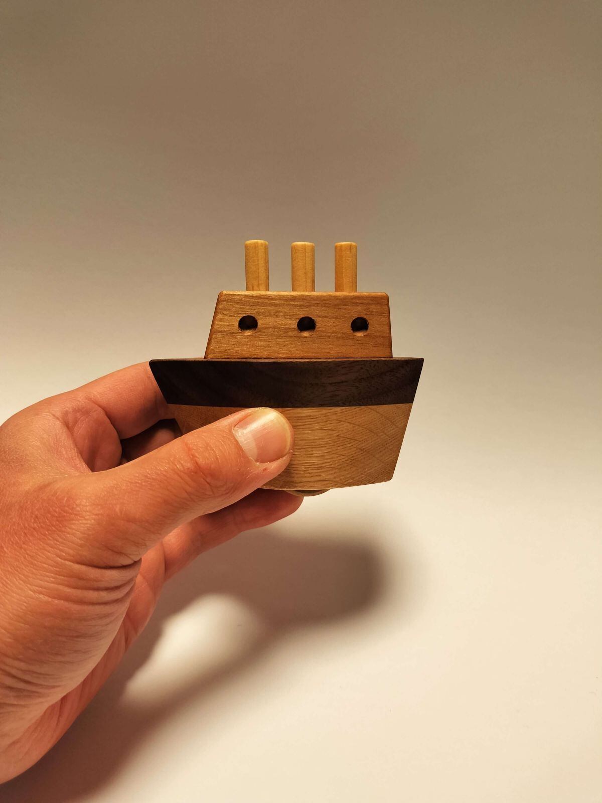 船の底部分には木で作った車輪を取り付けています。手転がしで棚やデスクの上を航海することができます。