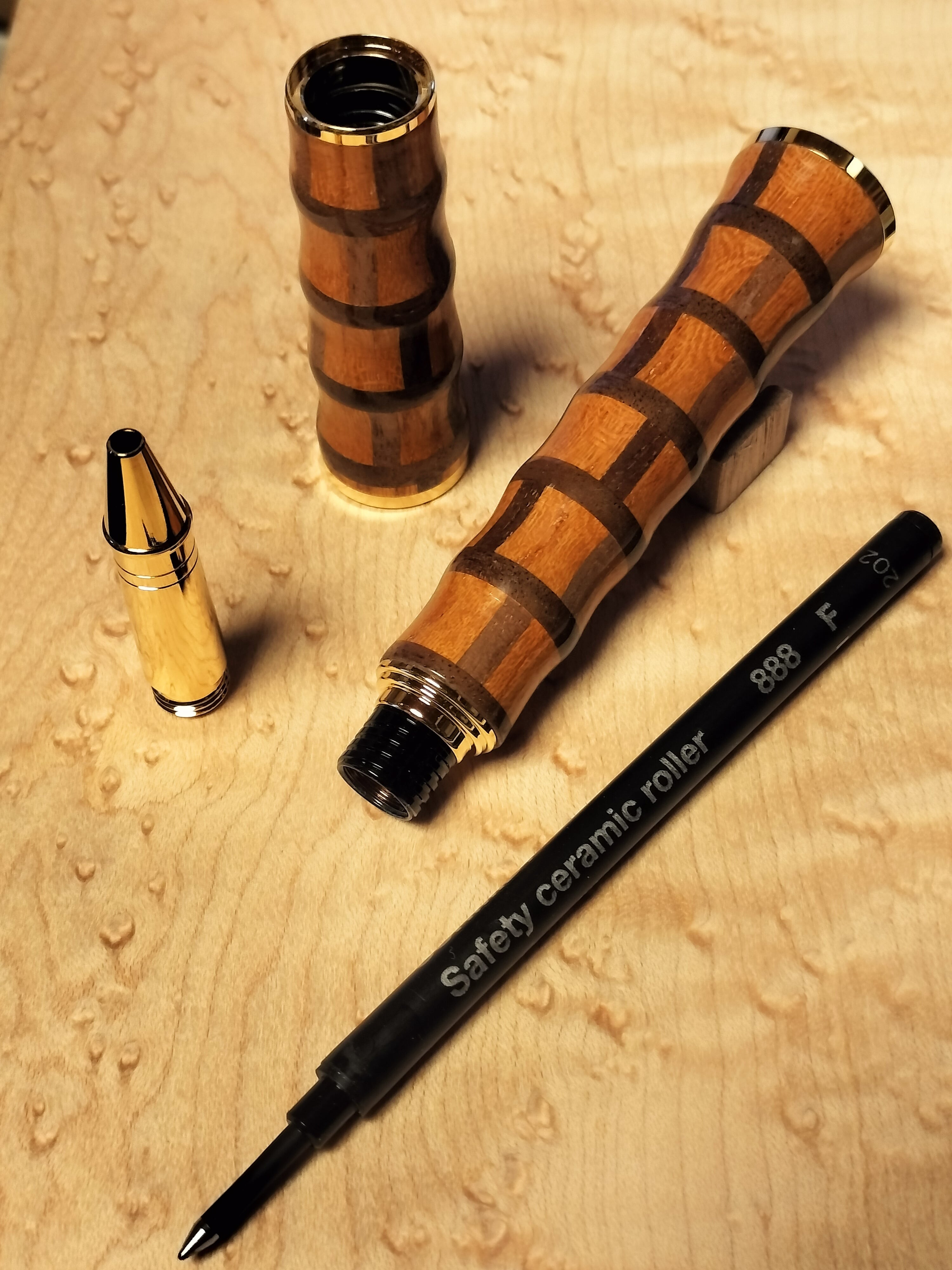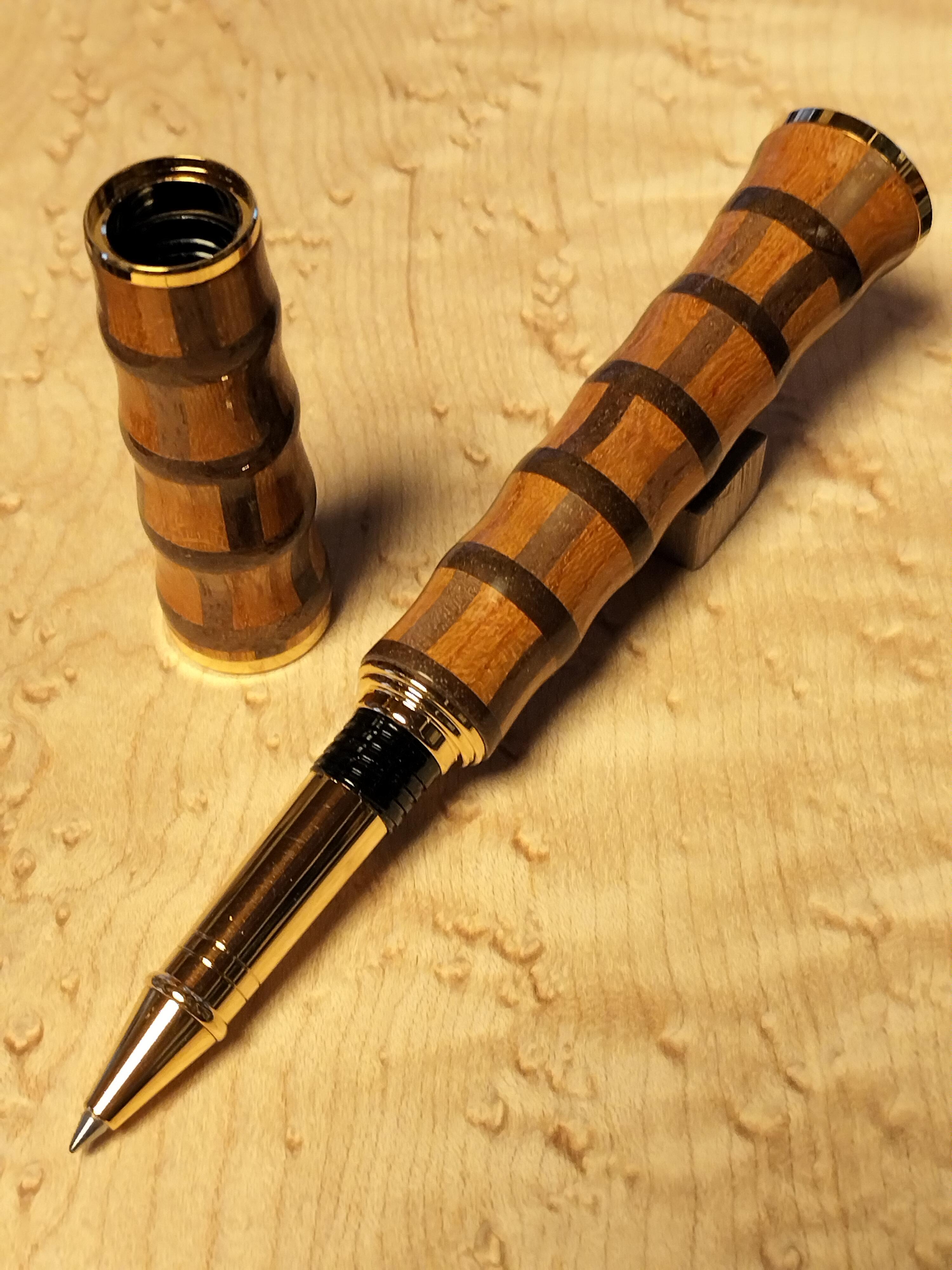 桜の優しい色合いとウォルナットの深いコントラストを組み合わせ、表面には波のような立体的な削りを施したボールペンです。